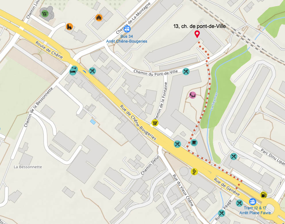 Bus 34, arrêt Chêne-Bougeries (3 min. de marche)